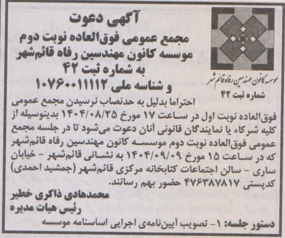 احتراما بدلیل به حد نصاب نرسیدن مجمع عمومی فوق العاده نوبت اول در ساعت 17 مورخ 1404/08/25 بدینوسیله از کلیه شرکاء یا نمایندگان قانونی آنان دعوت می شود تا در جلسه مجمع عمومی فوق العاده نوبت دوم موسسه کانون مهندسین رفاه قائم شهر که در ساعت 15 مورخ 1404/09/09 به نشانی قائم شهر-خیابان ساری-سالن اجتماعات کتابخانه مرکزی قائم شهر(جمشید احمدی) کد پستی 476387817 حضور بهم رسانند.